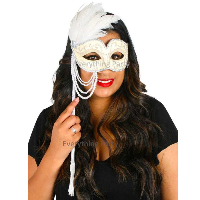 Mask with stick, decorated with feathers and pearls