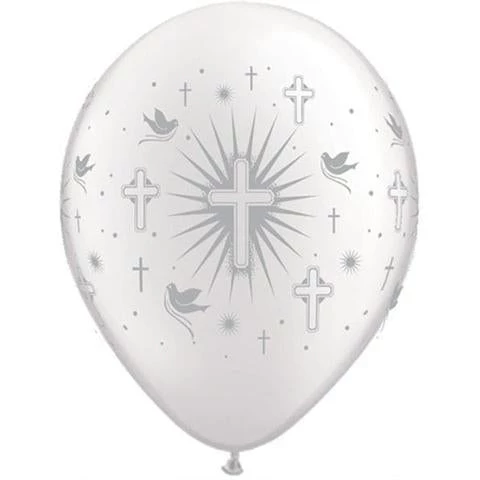 Everything Party 11″ Qualatex Silver Cross & Dove Pearl White Latex Balloon