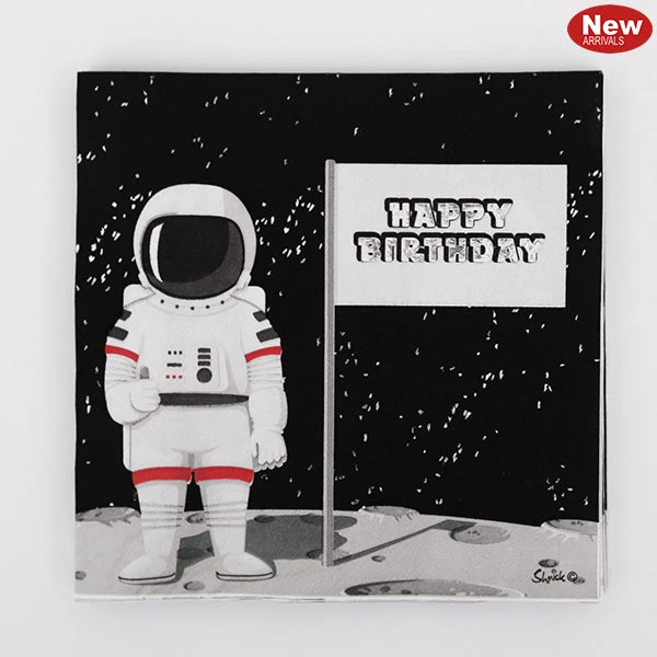 Space theme party napkin, featuring an astronaut stands on the Moon with happy birthday flag.Â