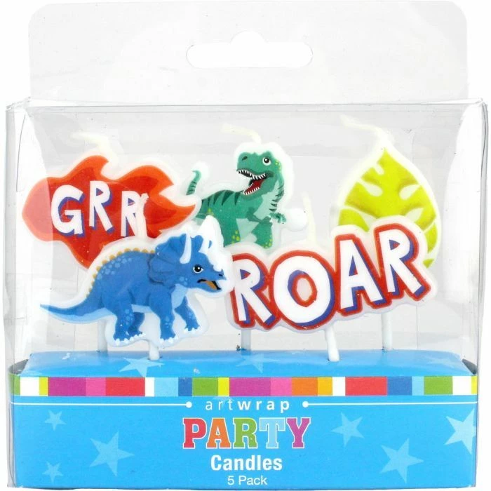 Set contains candles in the shape of various dinosaurs and the words ‘GRR’ and ‘Roar’.
