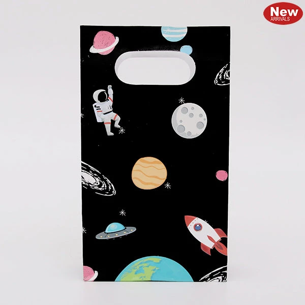 Space theme party loot bags, featuring astronaut, rocket, spaceship and plants.