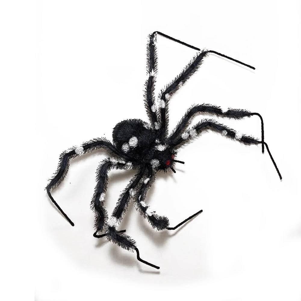 This spider is covered in a light black faux fur with white spots and red eyes, it’s body is made of polyurethaneÂ