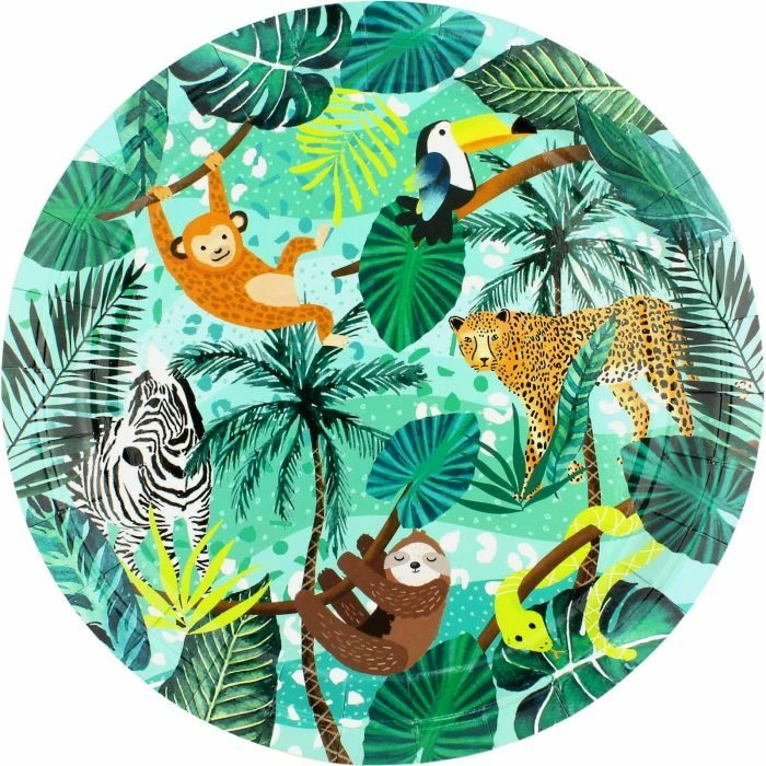 pack of 8 Jungle theme paper plates featuring an assortment of colourful jungle animals