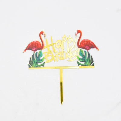 Acrylic mirror cake topper with Gold Happy Birthday and Flamingos