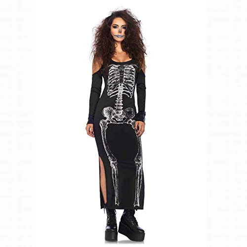 This Skeleton Cold Shoulder Womens Costume is perfect for your upcoming Halloween look! This costume features a black dress printed in a skeleton design with long sleeves that have cold shoulders at the top and a long skirt with a side slit down the bottom.