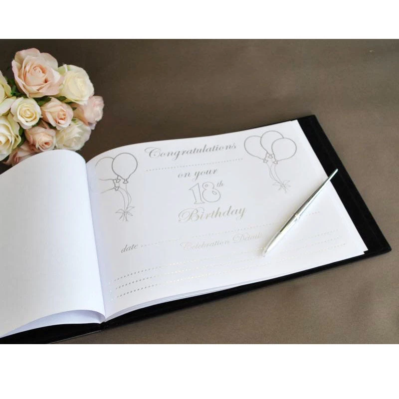 The book features 36 pages including a celebration cover page, a section for birthday wishes,memories and guests and gifts. The internal writing is in silver and the book is finished with a black felt backing.