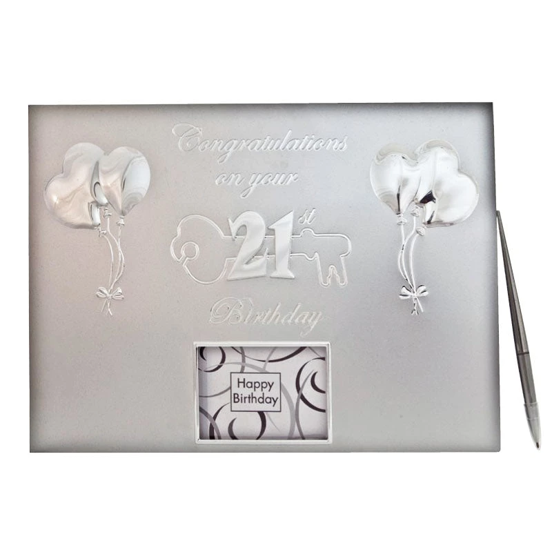 This stunning aluminium 21st birthday guest and memory book is the top of the line when it comes to beautifully storing your18th birthday memories. The guest book features space for a picture or name plaque and has the wording “Congratulations on your 21st Birthday” with a picture of two stars and balloons on cover.