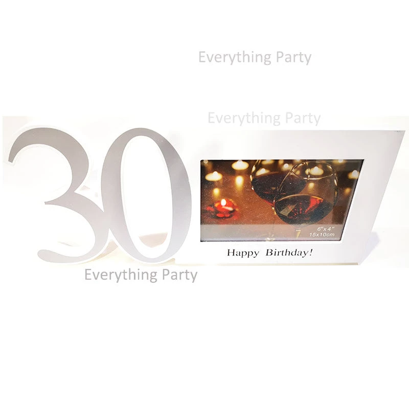 Modern white MDF photo frame. This quality photo frame is the perfect keepsake for an 30th birthday gift. The number is in silver with the words ‘Happy Birthday’ written under the 6×4″ frame.