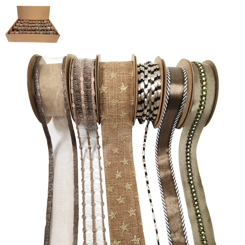 Assorted designs Gold Christmas ribbon for gift wrapping.