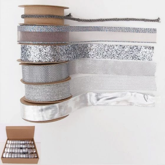 Assorted designs silver Christmas ribbon for gift wrapping.
