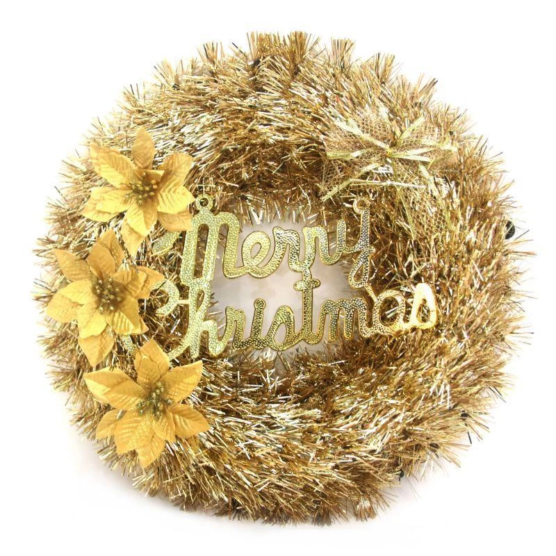 This gold tinsel wreath decorated with giltter gold Merry Christmas sign, flowers and gold bow
