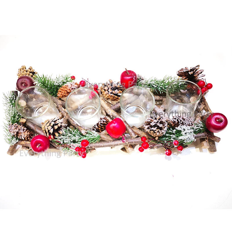 Christmas Tealight Candle Holder decorate with wooden pine corns, berries, apples and leaves.