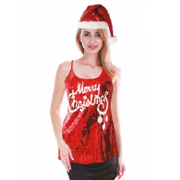 - Red Christmas sequin singlet with white sequin Merry ChristmasÂ