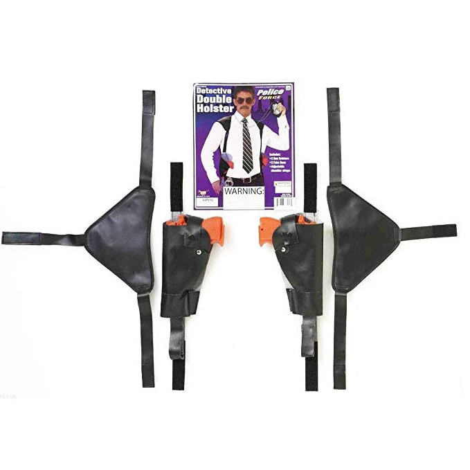 Includes: 2 gun holsters, 2 fake guns, adjustable shoulder straps