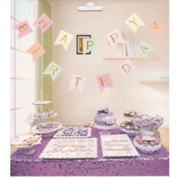 Mixed pastel colour banner with gold writing