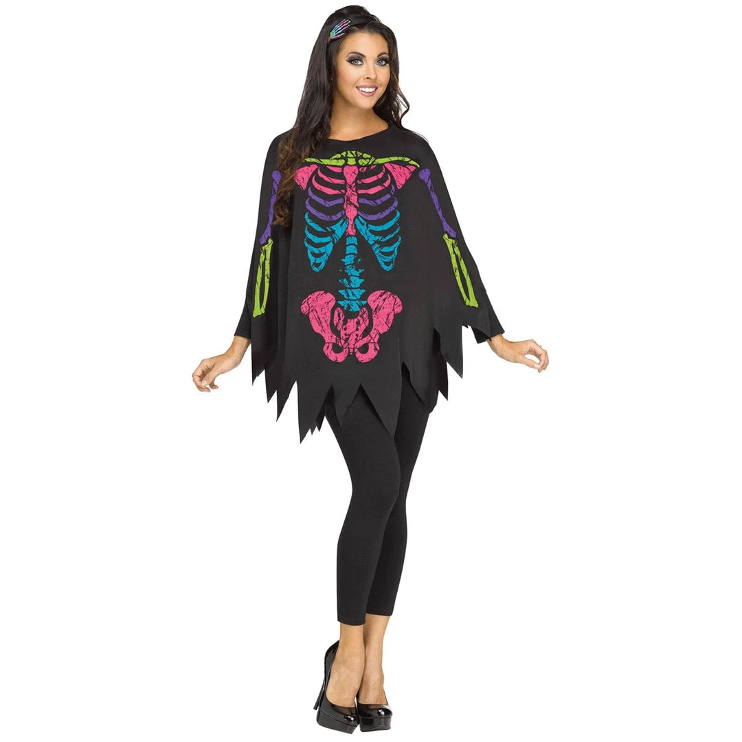 This Skeleton Womens cape is a great idea for a quick costume for Halloween. This black poncho features a white skeleton bone print on the front. Just add a pair of black leggings and skeleton make up for a complete look.