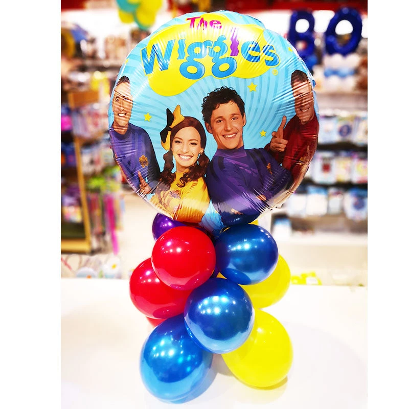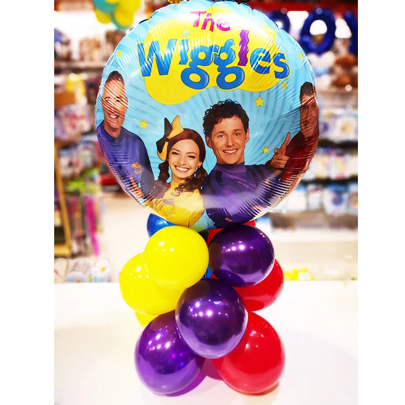 The Wiggles theme party balloon arrangement, this arrangement includes: 18″ Licensed the wiggles foil balloon, 5″ Qualatex latex balloon in Purple, Red, Yellow and Royal Blue