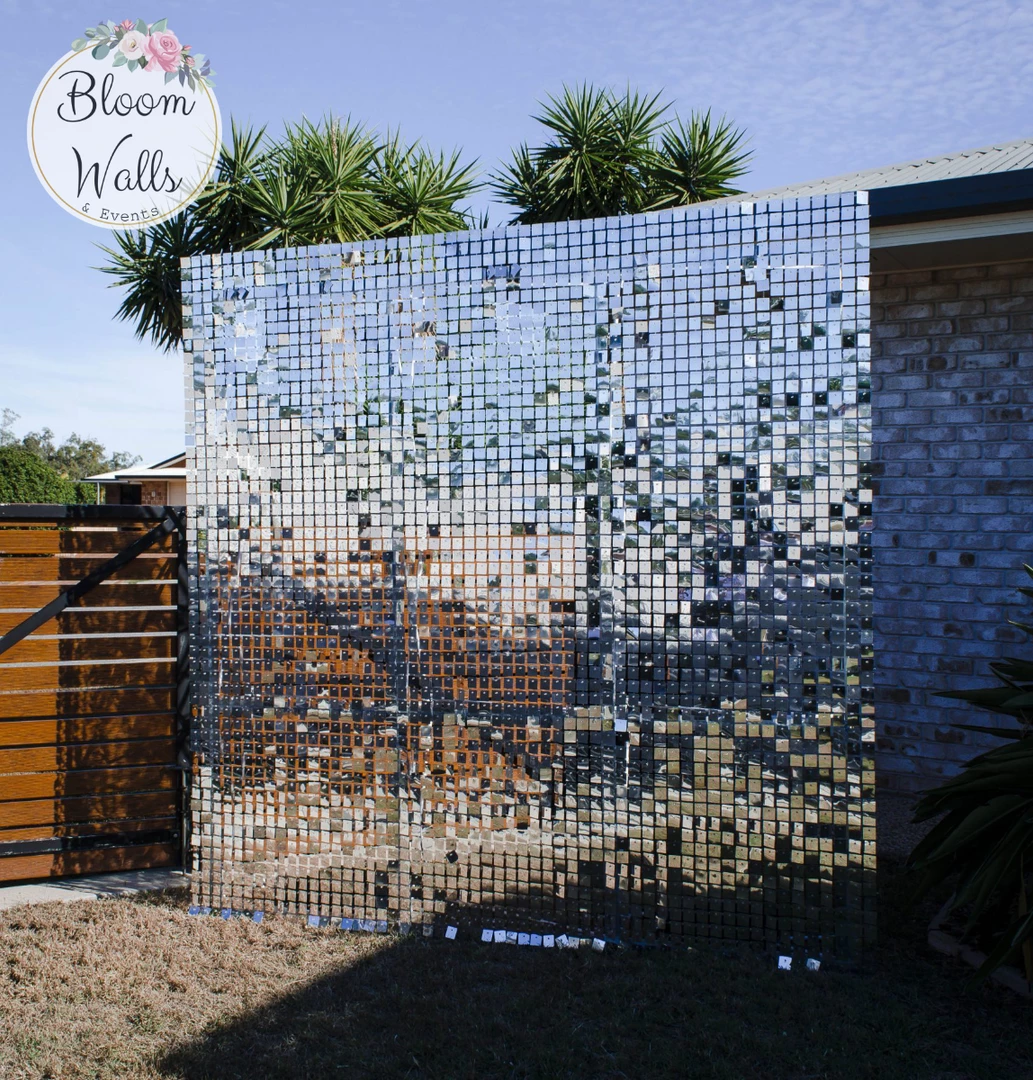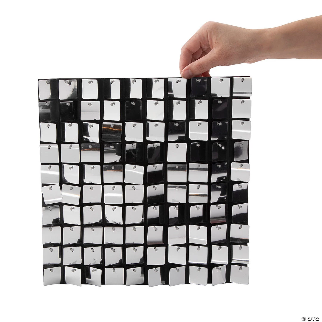 1 Unit includes 100 silver squares. Also includes interlocking transparent frame that supports the squares to give that floating look. Frames are designed so that multiple panels can automatically interlock (on all four sides) making it super easy to create shimmer walls as large as you need, simply hang from a backdrop or ceiling atachment. Frame is roughly 30cm high and 30cm wide.