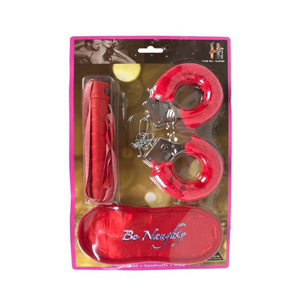 - Kit includes 1 whip, 1 set of handcuffs and 1 mask featuring the words “Be Naughty”