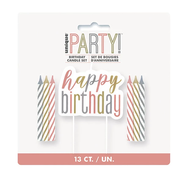 Includes: 12 candles in 3 colours and 1 Happy Birthday Cake Candle