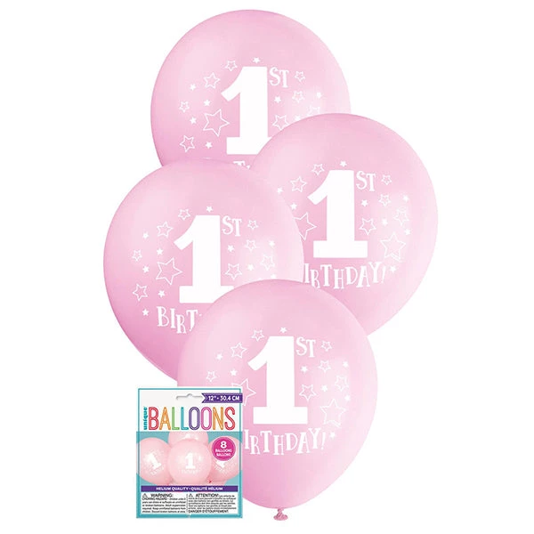 Unique Balloons 8pk 1st Birthday Stars Pink Latex Balloon 30cm